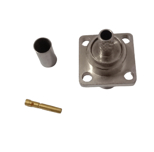 A 4-hole BNC female connector for panel mounting. It provides a permanent, secure crimp termination for LMR200 coaxial cable.