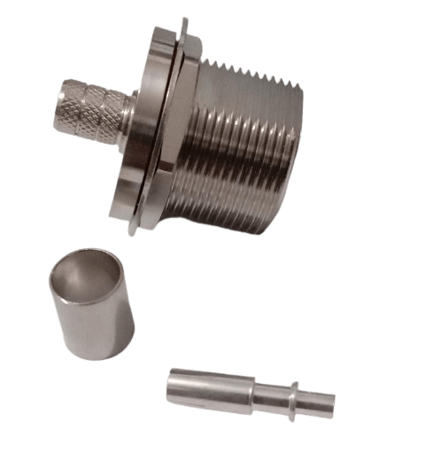 A DIN female bulkhead connector for panel mounting. It’s compatible with LMR400 cable and features a durable crimp-style termination.