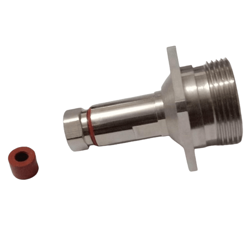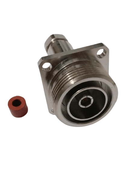This DIN female panel-mount connector is designed for secure, fixed installation on a chassis or enclosure using a standard 4-hole flange. The connector’s body is designed to provide a reliable termination for 1/4-inch coaxial cable using a clamp-style attachment. This termination method provides a strong mechanical and electrical connection, ensuring excellent performance and durability. The 4-hole mount provides a stable and secure anchor point, preventing rotation and physical stress on the connector. This component is widely used in radio equipment, test fixtures, and other professional devices where a secure, fixed connection point is required for smaller-diameter cables.
