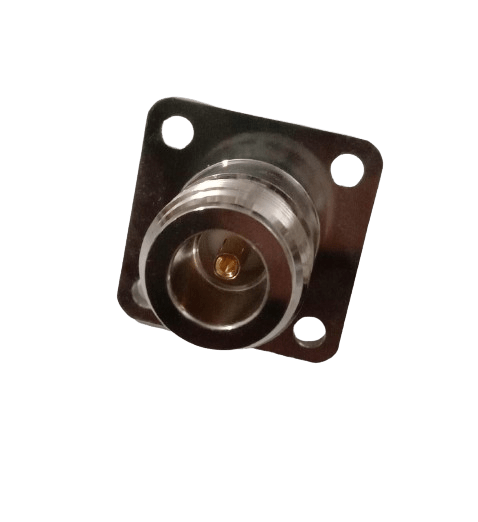 This N-Type female 4-hole panel-mount connector is engineered for secure and fixed installation on a chassis or enclosure using its standard 4-hole flange. It is compatible with 25mm diameter coaxial cable and features a solder-based termination for the center pin. Soldering creates a permanent and highly reliable electrical bond, which is crucial for maintaining signal integrity and minimizing signal loss at high frequencies. The 4-hole flange provides a stable and secure mounting point, ensuring the connector remains firmly in place. This connector is an excellent choice for custom cable assemblies and high-performance RF systems, including in professional broadcast equipment and test instrumentation.