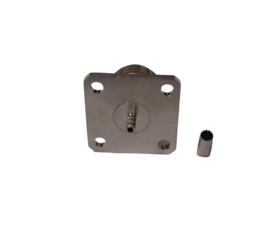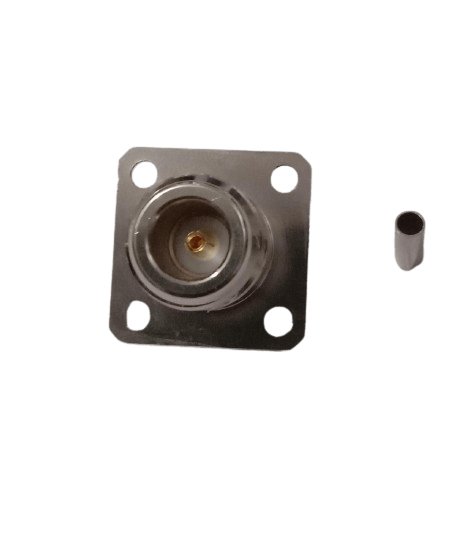This N-Type female 4-hole panel-mount connector is designed for secure, fixed installation on a chassis or enclosure using its standard 4-hole flange. The connector’s body is engineered to provide a permanent termination for LMR100 coaxial cable using a crimp-style attachment. This method is known for creating a strong, durable, and reliable electrical and mechanical bond that can withstand vibrations and physical stress. The secure mounting and robust construction make it an ideal choice for a wide range of professional applications, including telecommunications, test equipment, and industrial control systems.