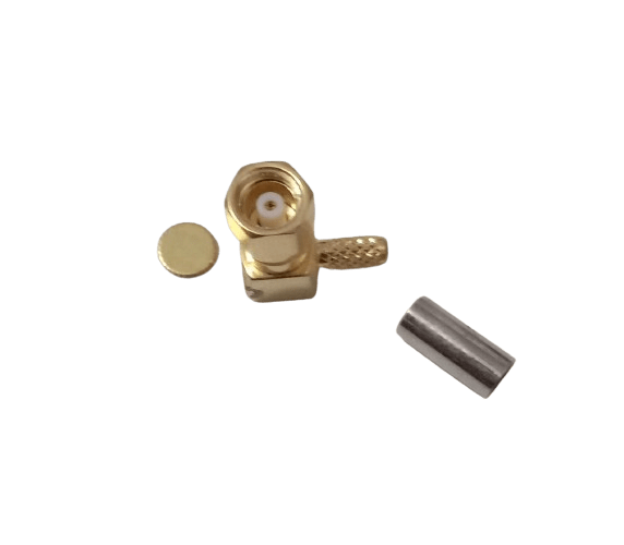 A right angle SMC female connector for LMR 100 coaxial cable. Its space-saving design and crimp termination are ideal for installations with limited space behind the connection point.