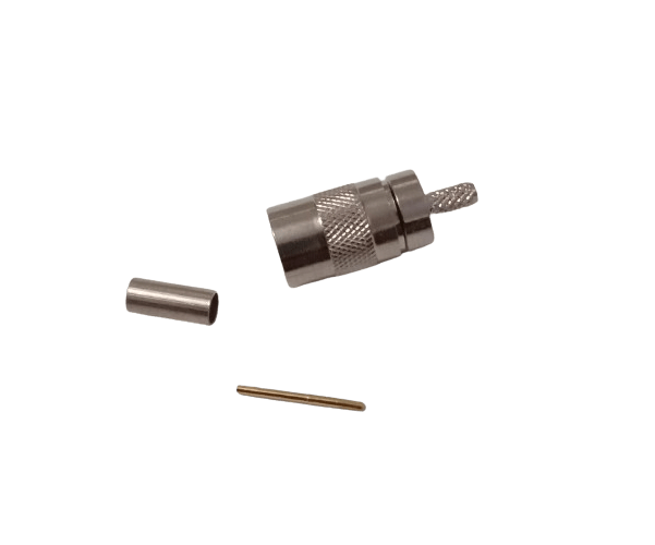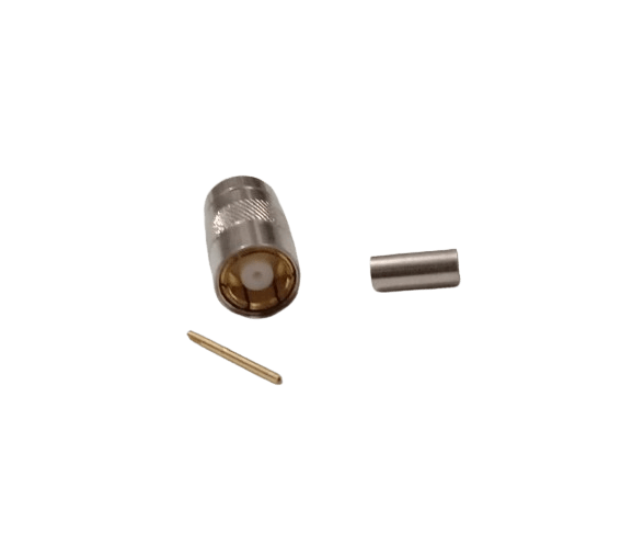A standard SMZ female connector for LMR 100 coaxial cable. It uses a crimp termination for a fast and secure assembly, suitable for professional cable assemblies.